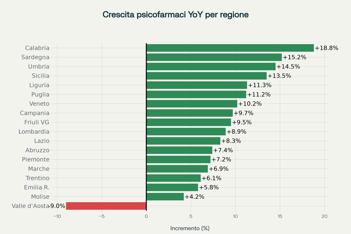 Calabria guida la crescita (+18,8%), seguita da Sardegna (+15,2%) e Umbria (+14,5%). Valle d'Aosta è l'eccezione (-9,0%). Tutte le altre regioni mostrano crescita dai 4,2% a 13,5%