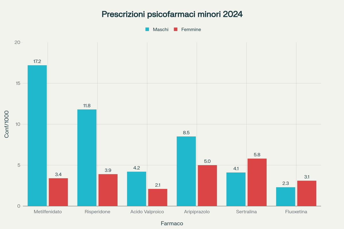 Le prescrizioni evidenziano marcate differenze di genere. Il metilfenidato viene prescritto ai maschi con un rapporto di 5 a 1 rispetto alle femmine. Il risperidone, altro antipsicotico, segna un rapporto di 3 a 1. L'acido valproico, stabilizzatore dell'umore, ha un utilizzo doppio nei maschi. Questo dato è coerente con l'epidemiologia: disturbi come l'ADHD e il disturbo della condotta colpiscono prevalentemente i maschi.