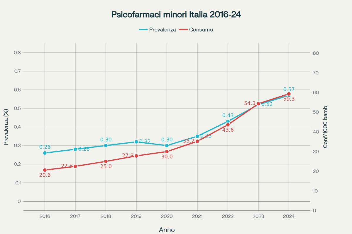 Raddoppio delle prescrizioni di psicofarmaci ai minori italiani dal 2016 al 2024 con accelerazione post-pandemia: prevalenza passata da 0,26% a 0,57%, consumo da 20,6 a 59,3 confezioni per 1000 bambini